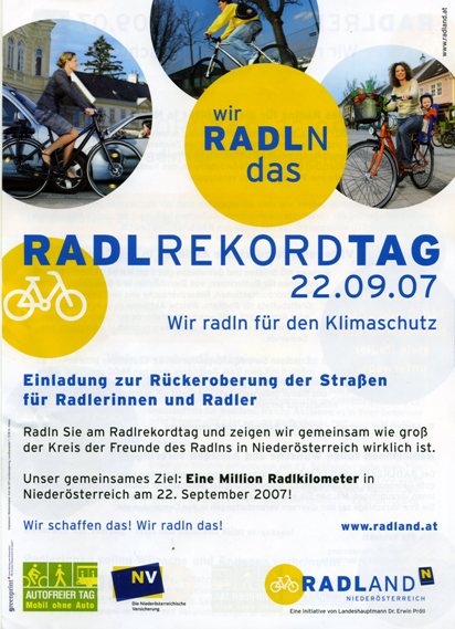 Am 22. Sept. fand in ganz Niederösterreich auf Initiative von Landeshauptmann Dr. Erwin Pröll der Radlrekordtag statt. Mit einem tollen Programm wartete die Marktgemeinde Pfaffstätten auf. Organisiert vom Arbeitskreis "Verkehrssparen" unter dem Vorsitz von GGR Karl Piffer, fanden die einzelnen "Bewerbe" großen Anklang beim Publikum.